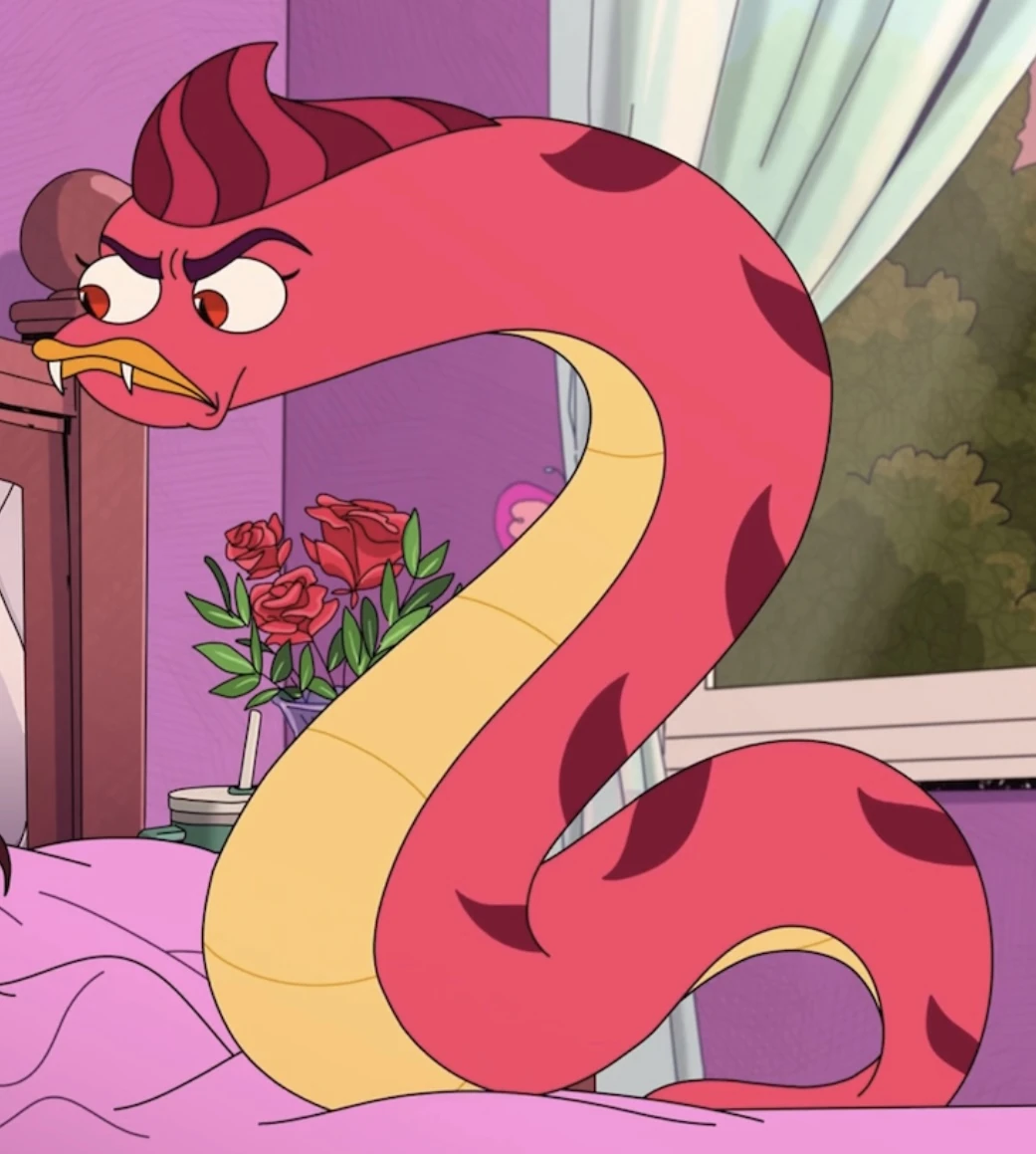 As a hate worm, she has the appearance of a tall dark pink snake with a burgundy pattern on her back. She has red eyes with black slit pupils, dark purple thick eyebrows, and bright orange lips with vampire-like fangs. She still keeps her hairstyle.